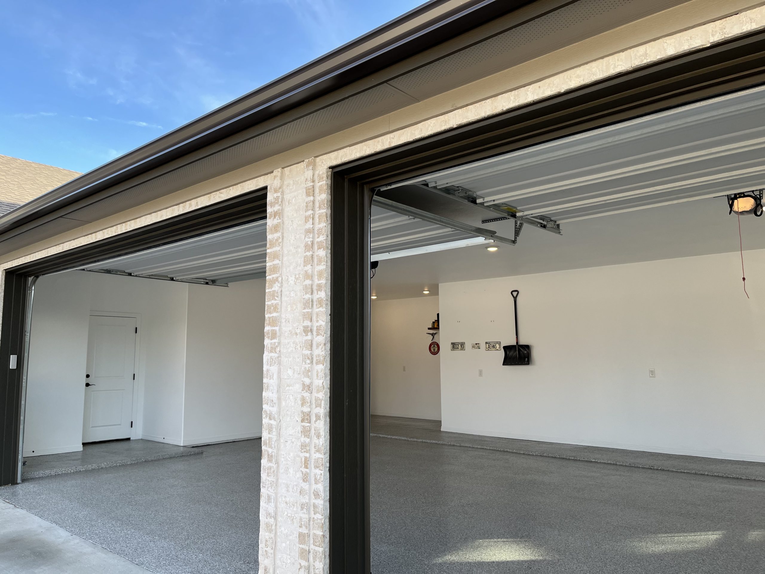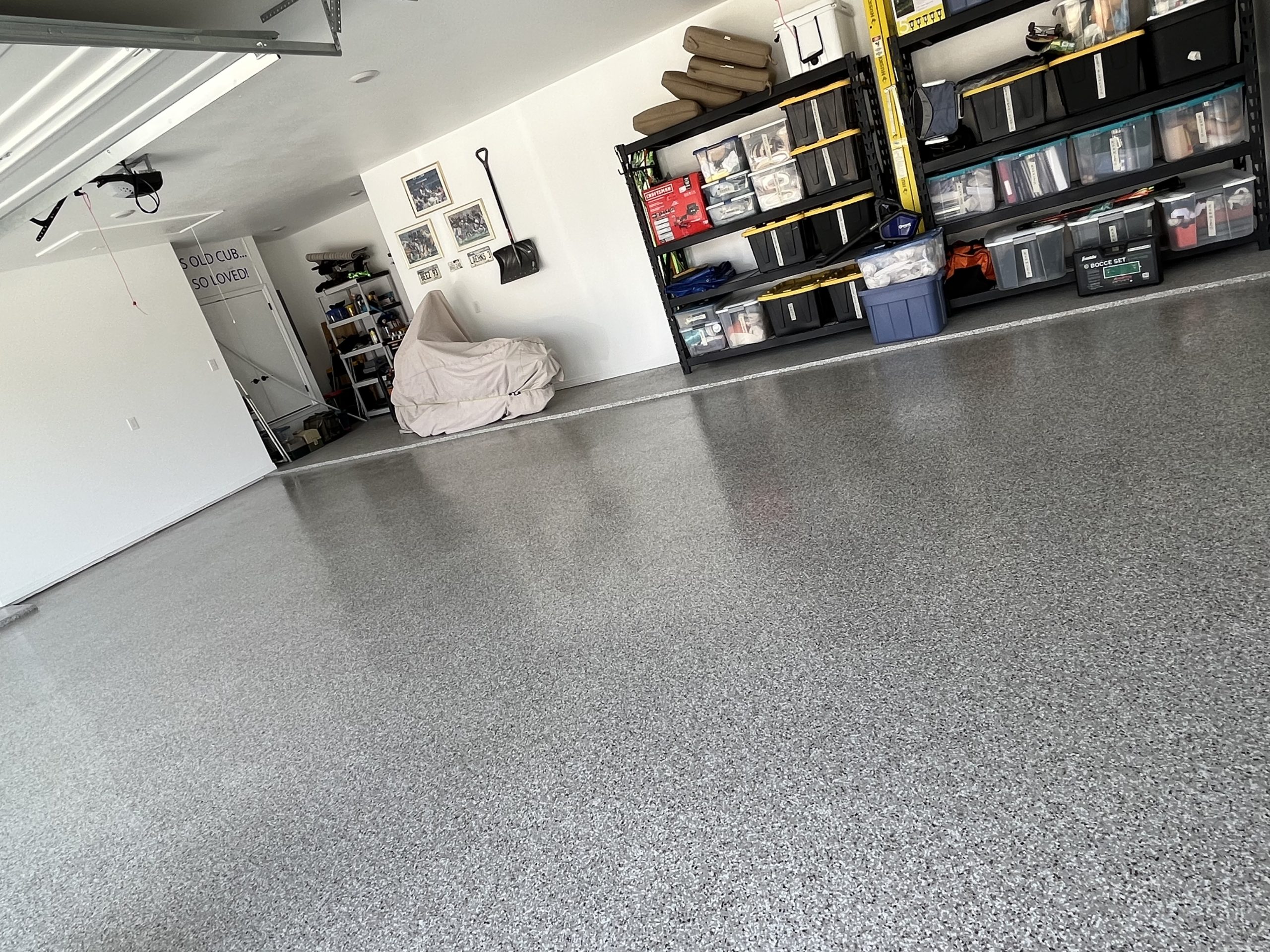 We then after scraping and removing all excess flakes, apply our proprietary polyaspartic clear topcoat in a gloss appearance to protect your floors for a lifetime.